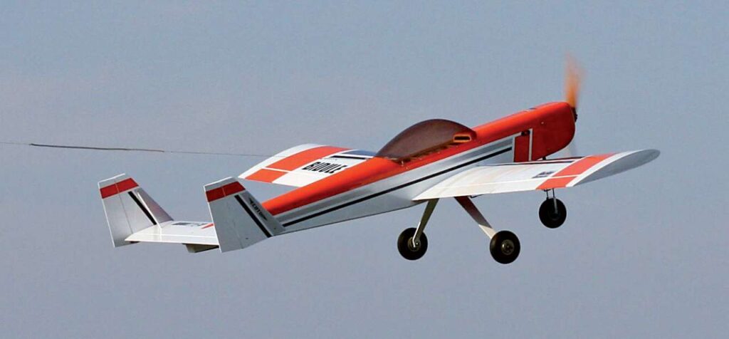 Premetto che quello che mi ha subito impressionato è stato il rumore dell’elica durante il rullaggio: sembra un Cessna, fantastico! Un sibilo piacevolissimo che su modelli elettrici di piccole dimensioni non si avverte. Già in rullaggio si ha la sensazione di essere al pilotaggio di un modello davvero speciale. In questa fase l’elettrico di grosse dimensioni si affianca allo scoppio come realismo. Il rumore a terra è forse più bello di quello di uno scoppio di grosse dimensioni. Non lo avrei mai creduto! In volo l’elica fa un bel rumore, di potenza. Gira, al massimo, ad oltre 6000 rpm e nella prova a terra non ho mai insistito perché chi teneva il modello mi ha immediatamente chiesto di ridurre i giri: non ce la faceva a trattenerlo… Il motore lo regolo col trim in modo che l’elica giri al minimo, un minimo stimabile in 6/700 rpm: questa regolazione la reputo indispensabile per avere sempre pronta la risposta all’accelerazione, specialmente per avere una risposta immediata ai piccoli spunti in atterraggio, indispensabili per portare il modello dove vuoi senza il ritardo che ha in genere il grosso motore elettrico, che ha un avvio improvviso, per poi girare progressivo più di un motore a scoppio. Ho mandato in volo i due modelli in tempi diversi, rispettando le istruzioni e maniacalmente la posizione del C.G. Il Bidule 116 ha decollato perfettamente, l’ho trimmato con due tacche a picchiare, mi sono portato in quota, ho estratto i flaps, ho provato lo stallo ed ho capito fin dove potevo arrivare. Ho continuato a volare con la riduzione del cabra che avevo programmato. Ho ripetuto la prova senza flaps, ho riprovato lo stallo ed ho capito che dovevo ridurre la cabrata ancora a fondo corsa per stare nel sicuro ed evitare lo stallo in tutti gli assetti. Poi altre prove, sempre in quota, con virate strette a destra e sinistra. Nessun problema purché mantenessi la riduzione dei comandi che avevo inserito con il dual-rate. Poi un paio di passaggi per verificare se la compensazione a picchiare a flaps estesi era sufficiente (avrei dovuto dare due tacche in più).
