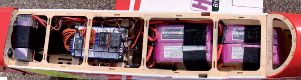 In basso: la posizione dei vari componenti elettrici: il regolatore è fissato al fondo della fusoliera e sopra vediamo la centralina Emcotec su cui e fissata la RX Spektrum a 9 ch ed il fly-log che controlla lo stato delle antenne delle tre unità di ricezione. L’alimentazione della radio avviene attraverso due batterie LiPo da 2500 mAh.