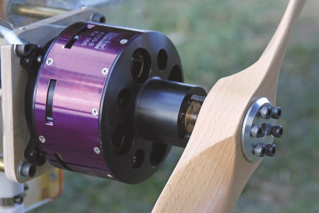 Il motore installato nella versione 116 è l’Hacker A-150-8 un propulsore che pesa 2100 grammi, 166 giri/V, 4 cuscinetti, 8800 W per15 secondi max. E’ stato fissato all’ordinata parafiamma con quattro colonette e viti da 6 mm dopo averlo fissato ad una seconda ordinata in compensato da 12 mm Per indirizzare l’aria all’interno della fusoliera sono state utilizzati ritagli di acetato trasparente fissati semplicemente con alcune viti alle parti in legno.
